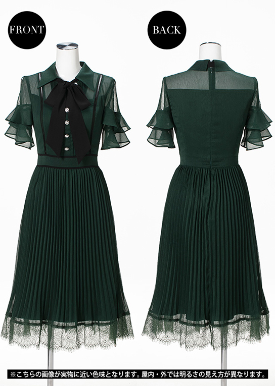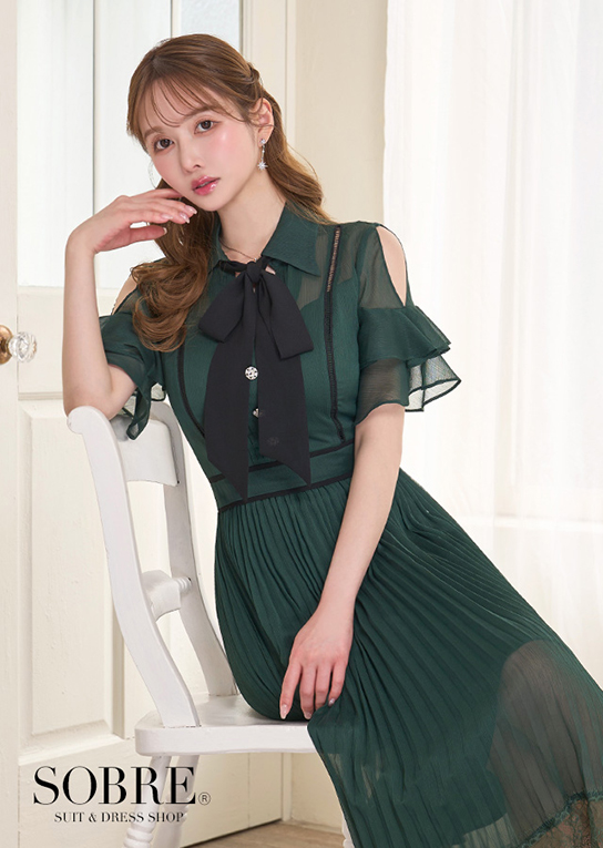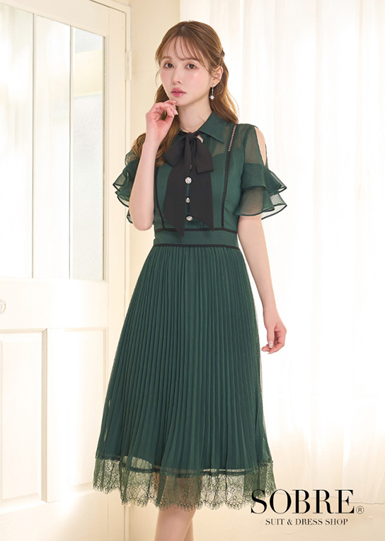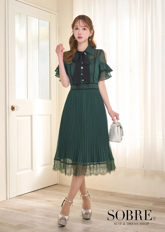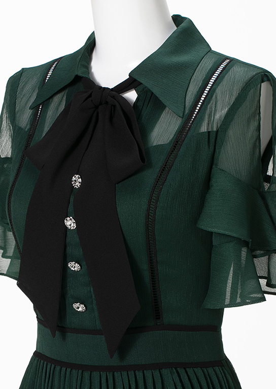 シャープな襟に大きめボウタイを添えた、華やかでクラシカルなミディワンピース。