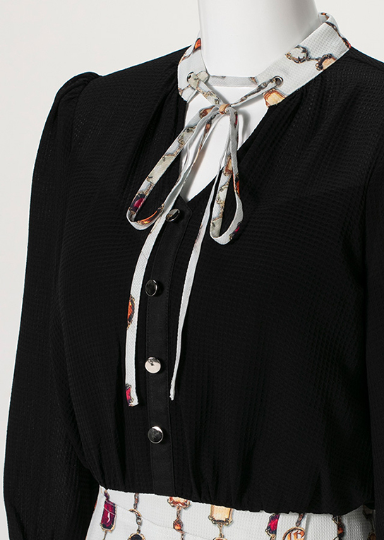 スタンドカラーに細めなリボンが大人なフェミニンさをプラス。