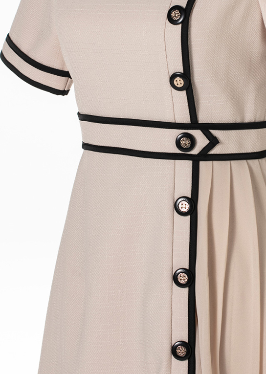 配色ボタンとパイピングがスタイリッシュなミニワンピース。