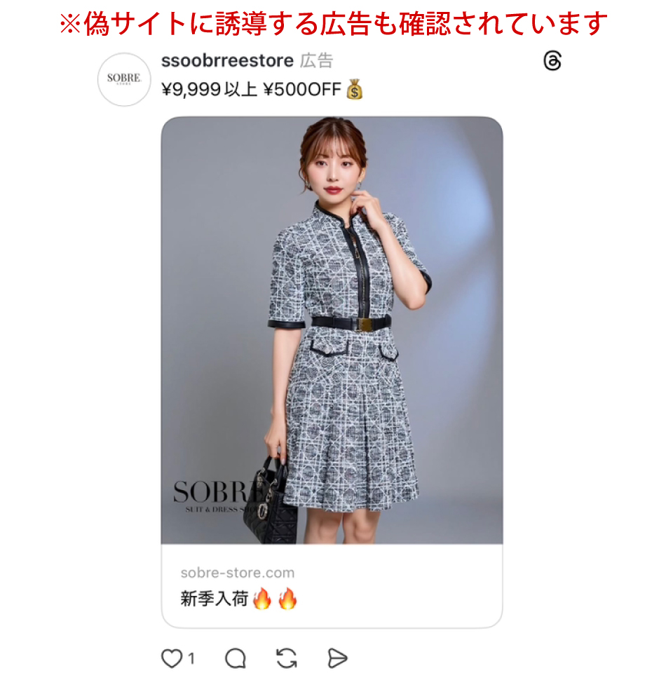現在、SOBREの社名や商品画像を無断で転載・悪用した「偽サイト」や「偽アカウント」が確認されています。