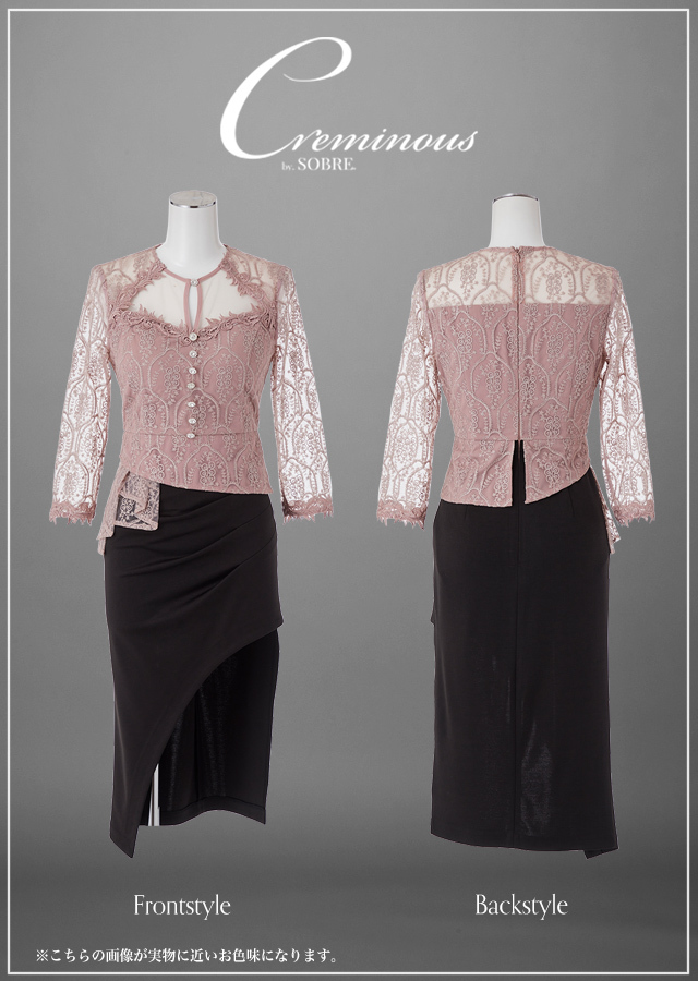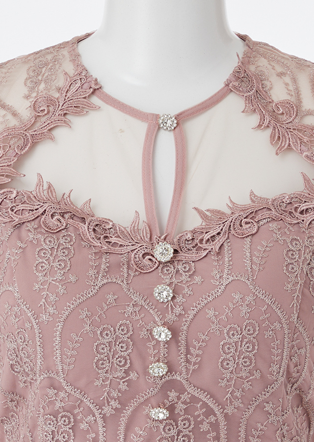くすみピンクが効いたワンピースドレス。