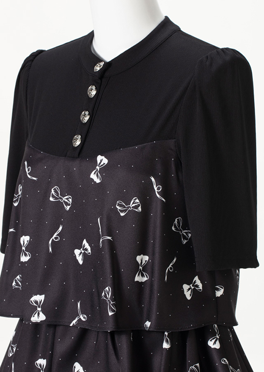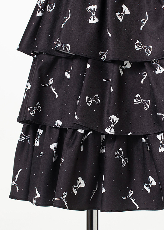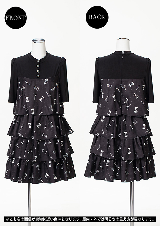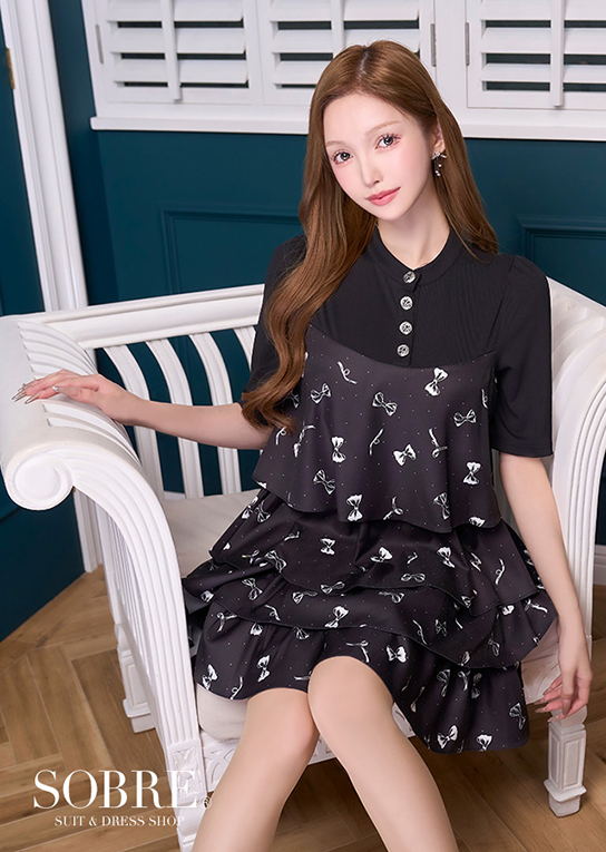 リボン柄×ティアードフレアが大人可愛いワンピースドレス。