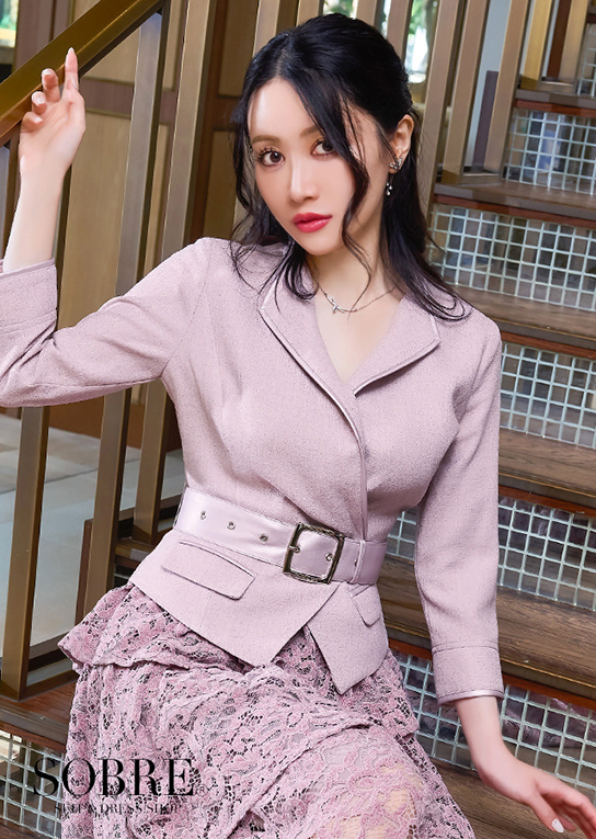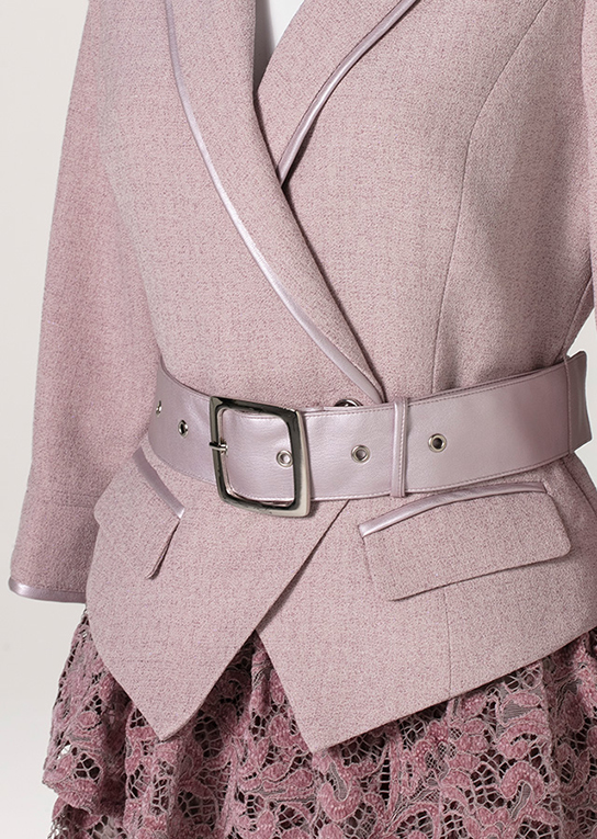 クラシカルなダブルブレストにフェイクレザーパイピングがシャレ見え。