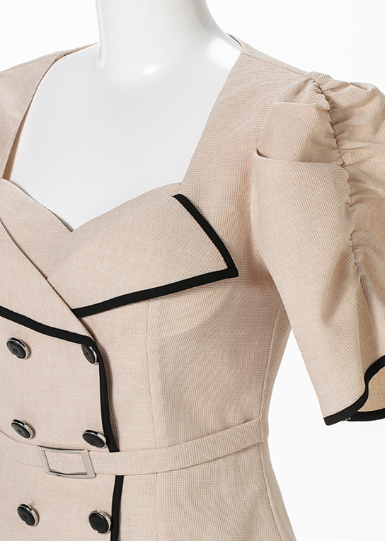 ブラックのパイピングやボタンにベルト風でスタイルを引き締めてくれます。