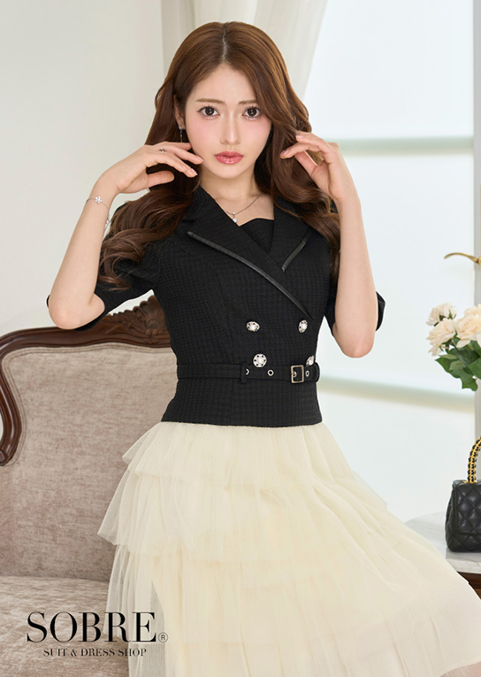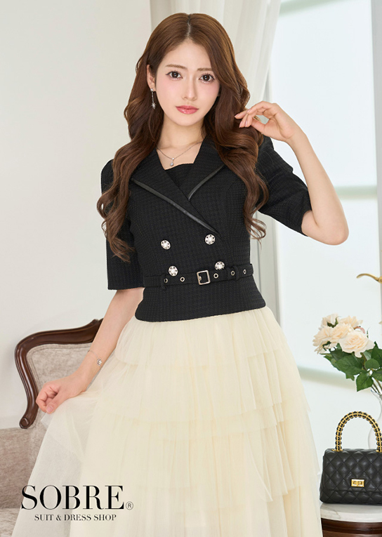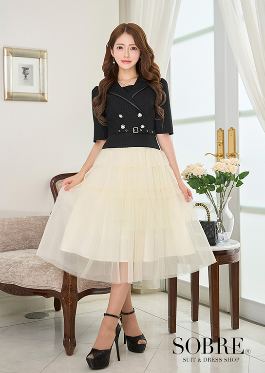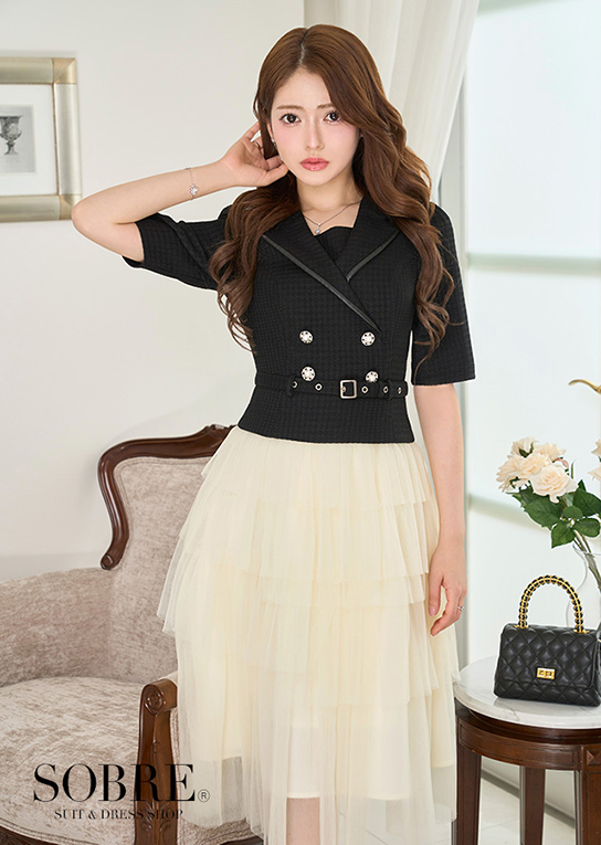 シャープなテーラードデザインと軽やかなプリーツスカートをドッキングした、