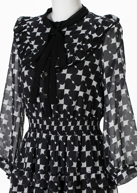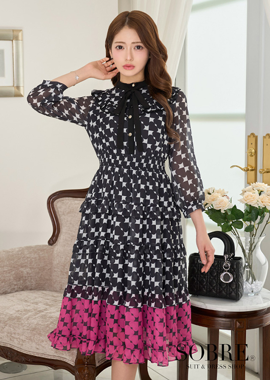 華やかでキャッチーな柄に黒のボウタイリボンで引き締めて上品アクセント。
