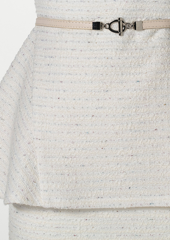 サイドフレアのロングペプラムでお腹まわりをカバーし、ベルトでウエストを作る。